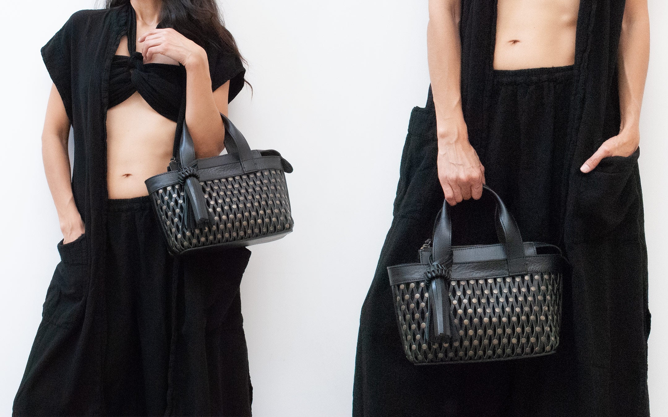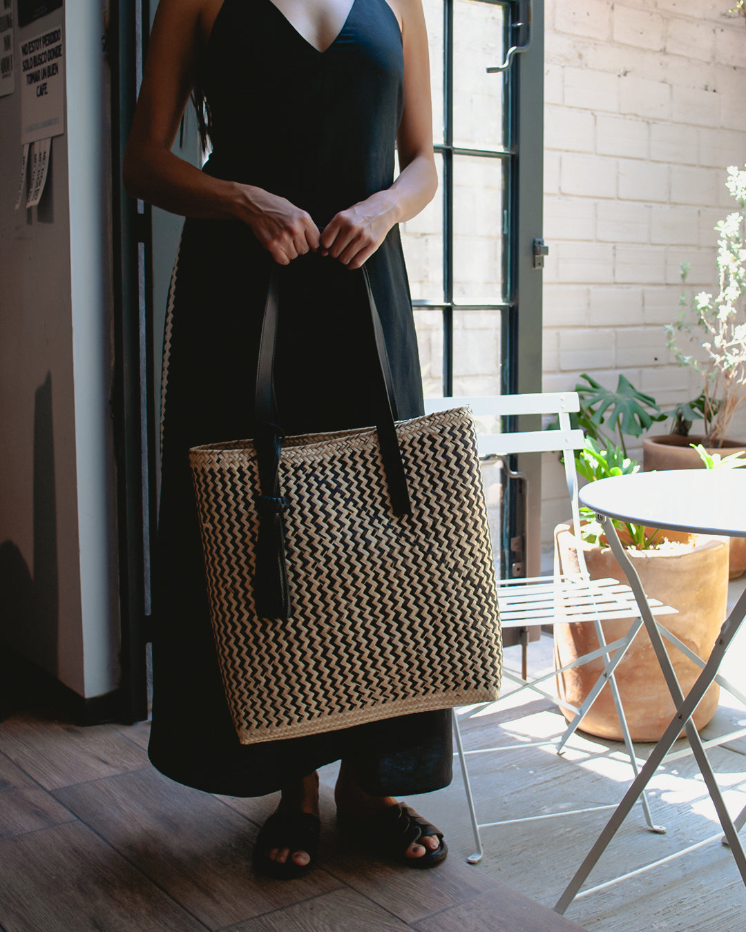 Palm Leaf Basket Bag w/ Zigzag Pattern & Black Leather Straps | CLEO