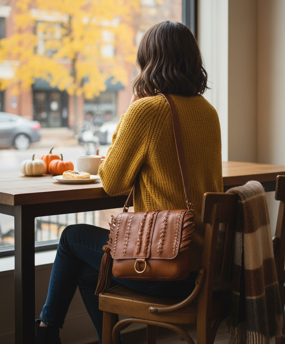 Black SENECA Leather Bag with Braids & Frings Details